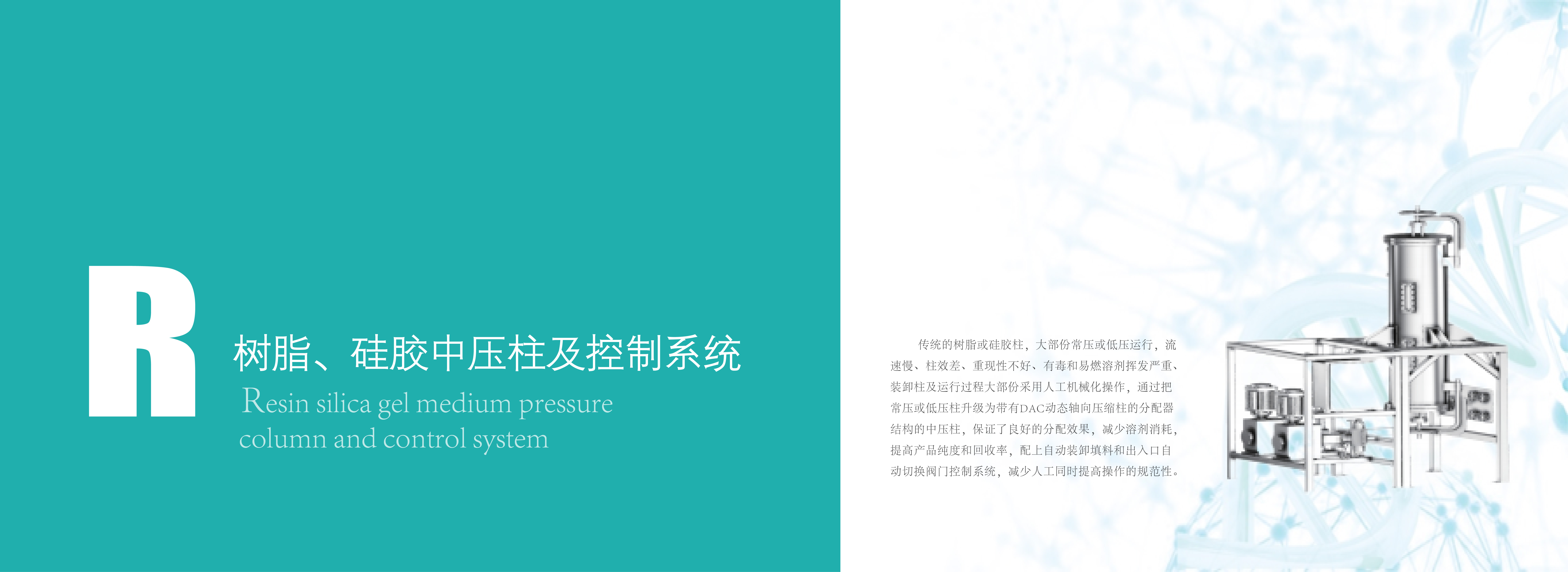 傳統的樹脂或硅膠柱,大部份常壓或低壓運行,流速慢、柱效差、重現性不好、有毒和易燃溶劑揮發嚴重、裝卸柱及運行過程大部份采用人工機械化操作,通過把常壓或低壓柱升降為帶有DAC動態軸向壓縮柱的分配器結構的中壓柱,保證了良好的分配效果,減少溶劑消耗,提高產品純度和回收率,配上自動裝卸填料和出入口自動切換閥門控制系統,減少人工同時提高操作的規范性。