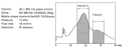 迄今為止,大多數糖類的分離介質僅僅局限在分析級別,但是富士硅膠研發出用于制備色譜的新的氨基硅膠。當使用高水相為流動相時,一般的氨基填料會暴露出很多問題。氨基硅膠的pH值很高,一般pH為9.0,在這樣高的pH條件下,目標化合物一般都會變性,并且會毀壞硅膠基質的表面。考慮到這些問題,富士公司研發出新的氨基硅膠填料,稱之為NH SG硅膠。NH SG硅膠可以最小化甚至是避免上述問題,并且對糖類化合物進行更好的分離。