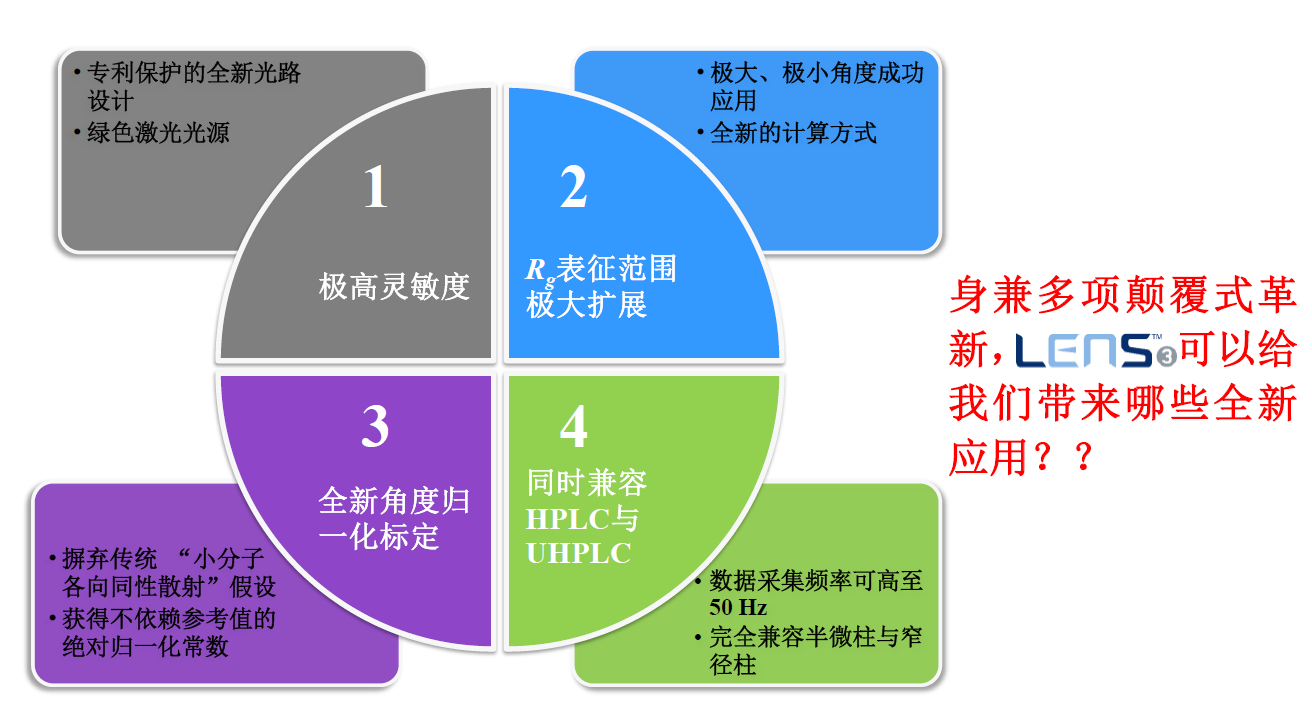 相較于自上世紀(jì)80年固有的光散射技術(shù),東曹推出的LenS3光散射采用全新設(shè)計(jì)概念,完美集成的一個極小角度(10°LALS),一個極大角度(170° High Angle Light Scattering, HALS),和一個直角度(90°RALS),從而達(dá)到: