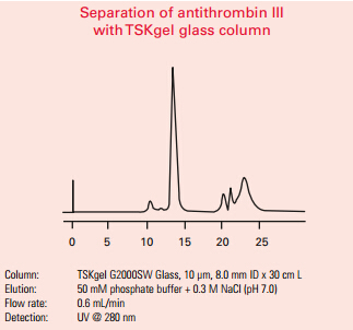SW型柱以高多孔性硅膠顆粒為基礎,其表面因受二醇功能基配體的衍生作用保護而不與蛋白質相互作用。TSKgel SW型柱憑借其大孔隙容積而勝過其它硅膠基質或聚合物高性能尺寸排阻柱。