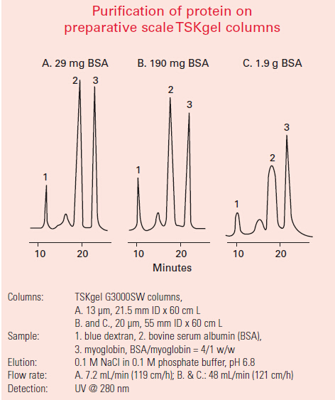 SW型柱以高多孔性硅膠顆粒為基礎,其表面因受二醇功能基配體的衍生作用保護而不與蛋白質相互作用。TSKgel SW型柱憑借其大孔隙容積而勝過其它硅膠基質或聚合物高性能尺寸排阻柱。