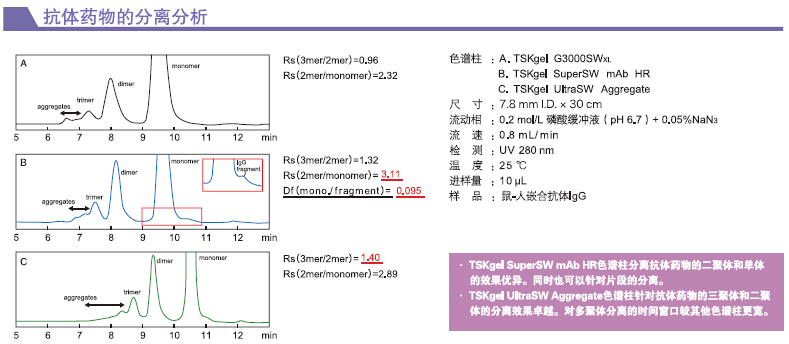TSKgel SuperSW mAb 系列色譜柱,是使用了粒徑4 μm的硅膠基質為填充材料的SEC色譜柱,適用于分析蛋白質。與TSKgel G3000SWXL 具有相同的分離范圍,可以分離分子量范圍很廣的蛋白質。特別是針對抗體藥物中的二聚體、單體、抗體斷片,具有優異的分離效果。抗體藥物中多聚體(三聚體及多聚體)的分析,則使用TSKgel UltraSW Aggregate色譜柱時的分離效果更佳。高分辨率分析可使用7.8 mmI.D.×30 cm尺寸的TSKgel SuperSW mAb HR色譜柱。快速分
