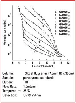 TSKgel G2000Hhr色譜柱內裝填的是多孔的剛性聚合物顆粒。適合對分子量小于10,000 Da的寡聚物和聚合物進行非水相分離。TSKgel G2000Hhr色譜柱的出貨溶劑是THF,可以置換成其他各種有機溶劑。