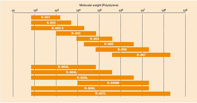 GPC K-805是標準的油溶性SEC色譜柱,適用于從低分子量到高分子量的寬范圍的樣品。流動相是氯仿。
