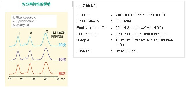 對于蛋白質(zhì)純化用色譜柱的清洗/殺菌常采用堿性溶液進行定位清洗的方法(CIP:cleaning in place)。YMC-BioProl離子交換填料因為具有卓越的耐堿性,所以即使使用1M NaOH實施20次的CIP也能維持高DBC和收率,而不會發(fā)生分離特性的改變。