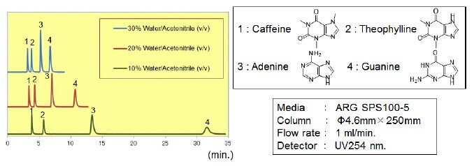 親水化合物一般是用反相模式來(lái)進(jìn)行分離,例如使用C18填料。但是,仍然有很多親水的化合物不能用普通的反相模式來(lái)分離。近些年來(lái),HILIC模式的填料應(yīng)運(yùn)而生,特別適合分離親水性化合物(極性大的化合物)。富士硅化學(xué)有限公司開(kāi)發(fā)了HILIC模式的“ARG硅膠”。ARG硅膠可用于分離氨基酸、多肽、維生素和核酸。不同粒徑的ARG硅膠可分別應(yīng)用于分析以及大規(guī)模的分離純化。