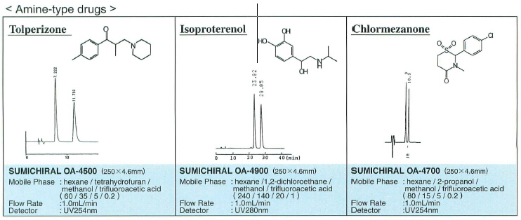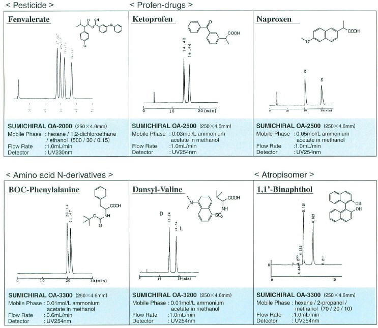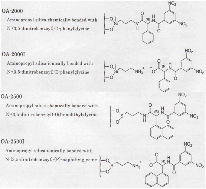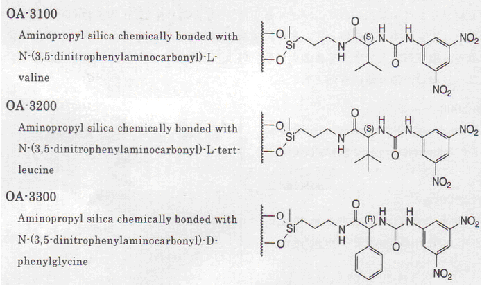 Pirkle型手性柱是將氨基酸的3,5-二硝基苯酰基衍生物作為手性選擇劑,改良型是將萘乙二胺二鹽酸鹽作為手性選擇劑。主要通過電荷移動和氫結合相互作用來識別手性。OA-2500或OA-3300可有效分離含有-COOH的手性化合物。采用將氨基酸的N位進行NBD標記的方法,用于D型氨基酸的微量分析。此外,OA-4000系列在胺類系醫藥品、酒精類、酯、氫胺等眾多化合物正相直接分離方面發揮了優越的性能。