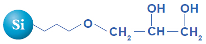 二元醇基鍵合色譜柱在正相條件下,較硅膠色譜柱,能夠更好地識別化合物的親水性差異。利用這個特性的效應,實現了親水性差異較小的化合物的相互分離。并且,通過均一的二元醇基處理,防止了硅烷醇基的影響所造成的水的非特異性吸附,因此,可使用水100 %洗脫液進行清洗。可輕松地清洗吸附在填料上的高極性化合物,長期使用色譜柱。并且,較硅膠色譜柱,樣品負荷量大,最適于制備HPLC