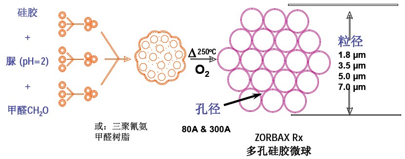 所有安捷倫ZORBAX色譜柱都是由以硅溶膠為基質的多孔硅膠微球(PSM) 制成的。這些硅膠顆粒是由微小的固態溶膠微粒,以一種專利的聚合方法膠合而成的,然后在很高的溫度下熔合,形成最終的顆粒